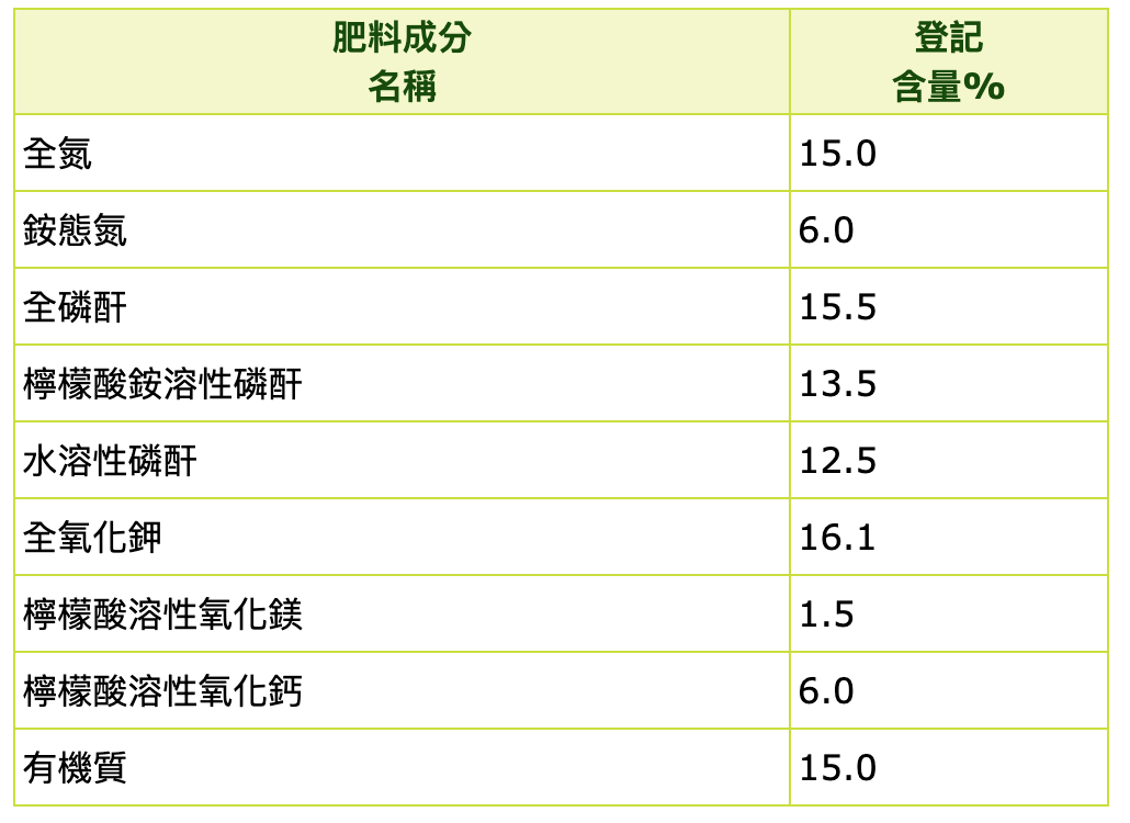 ✅ 全氮15%、全磷酐15.5%、氧化鉀16.1%